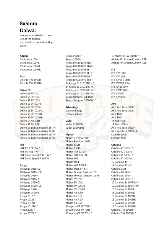 Admira, Blast, Daiwa SS, HRF, Ryoga, Advantage, Vadel, Alphas, IT’S, Aird, Catalina, Zillion, Steez, SPARTAN, Smak, Saltiga, Saltist, Daiwa T3, Daiwa Z, Tatula, Tanasensor, Fuego, MILLIONAIRE, Morethan, Light game ICV, KYOHGA, Kohga, Tatula TWS 300, 301
